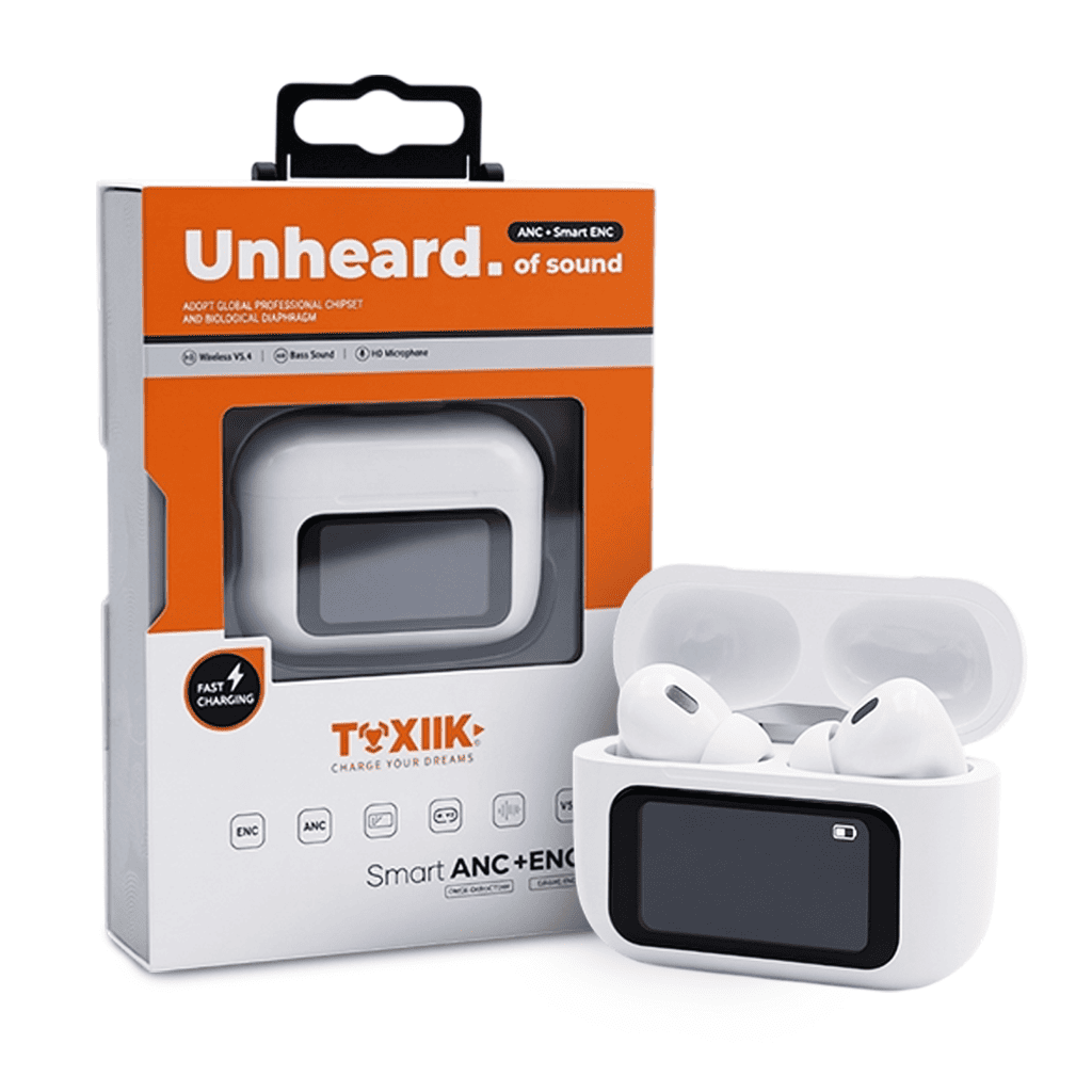Control total en tu mano. Audífonos Toxiik TOK-300 con pantalla LED integrada, cancelación activa de ruido (ANC + ENC) y carga ultra rápida.